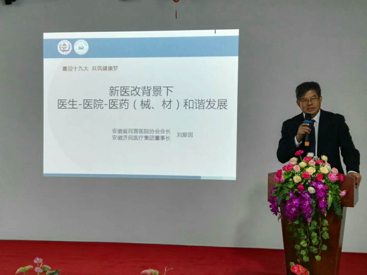 會上安徽省民營醫(yī)院管理協(xié)會會長、安徽省濟(jì)民醫(yī)療集團(tuán)董事長劉愛國先生,進(jìn)行了《新醫(yī)改背景下醫(yī)生-醫(yī)院-醫(yī)藥(械、材)和諧發(fā)展》主題報告演講,從不同的視角詮釋了新形勢下醫(yī)生——醫(yī)院——醫(yī)藥(械、材)發(fā)展的新思路。