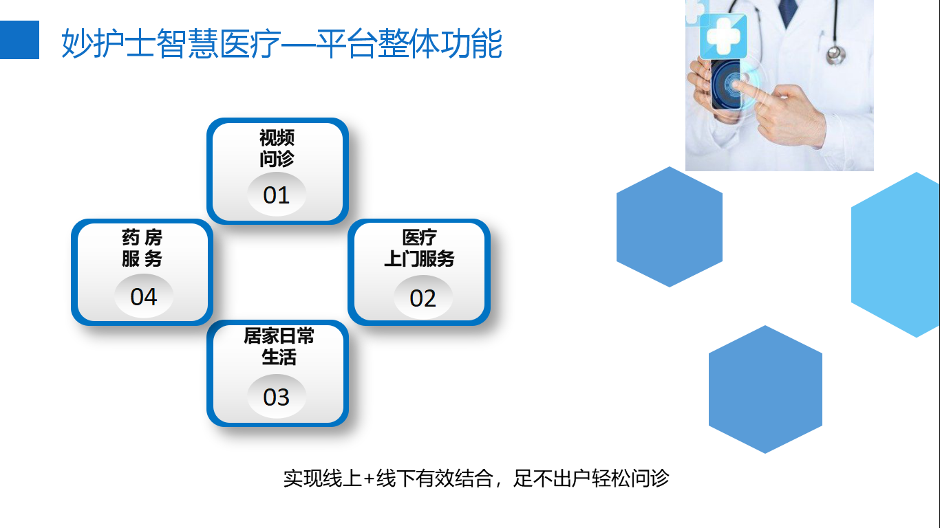 通過(guò)妙護(hù)士微信公眾號(hào)和 APP,一鍵預(yù)約,簡(jiǎn)單便捷。利用手機(jī)和妙護(hù)士專用視頻設(shè)備,為本地醫(yī)療機(jī)構(gòu)搭建一個(gè)功能強(qiáng)大的網(wǎng)絡(luò)服務(wù)系統(tǒng)。為社會(huì)公眾提供醫(yī)院、社區(qū)、藥房等就醫(yī)、購(gòu)藥全流程的閉環(huán)完整服務(wù)。